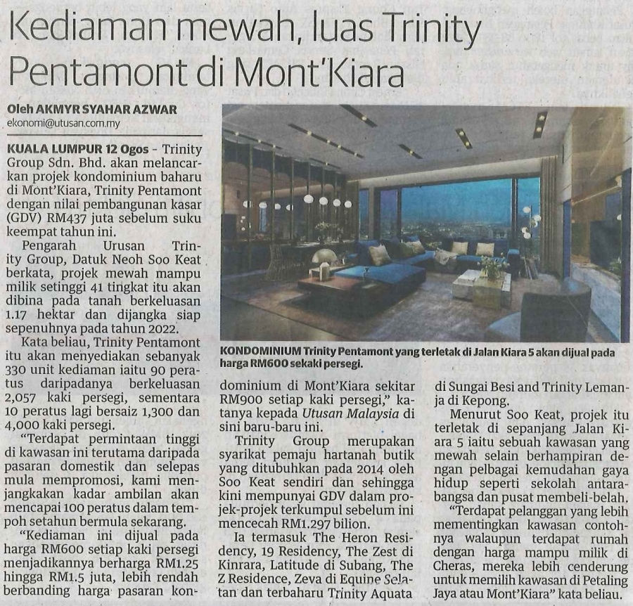 KUALA LUMPUR 12 Ogos - Trinity Group Sdn. Bhd. akan melancarkan projek kondominium baharu di Mont'Kiara, Trinity Pentamont dengan nilai pembangunan kasar (GDV) RM437 juta sebelum suku keempat tahun ini.